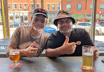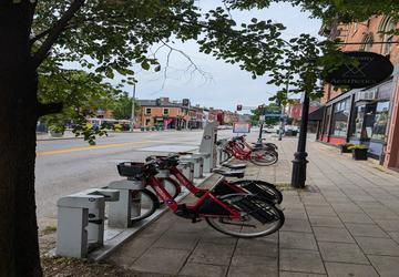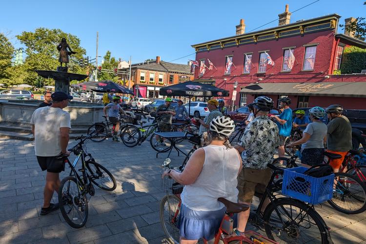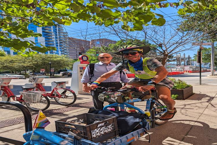 Outside Covington Books and Coffee with Joe Humpert, a member of the Queen City Bike Board.
